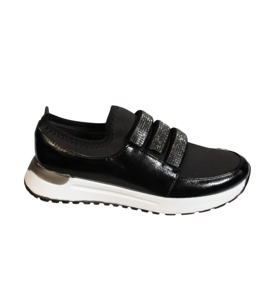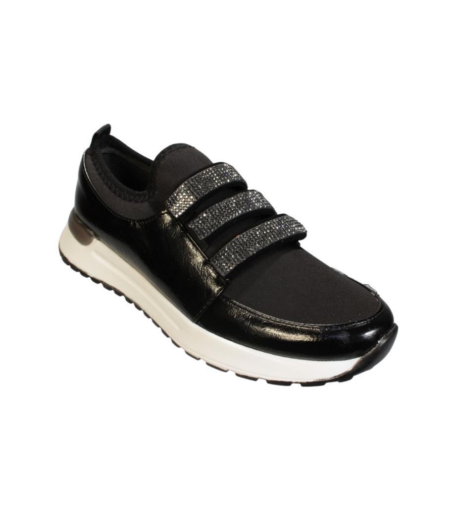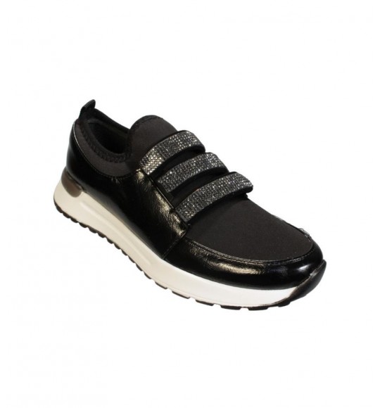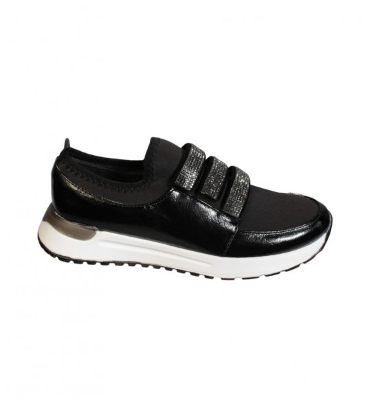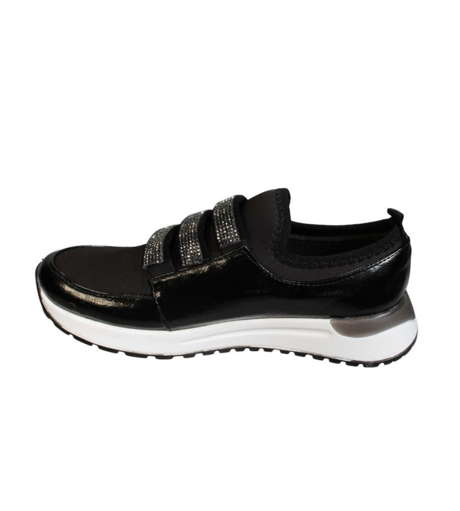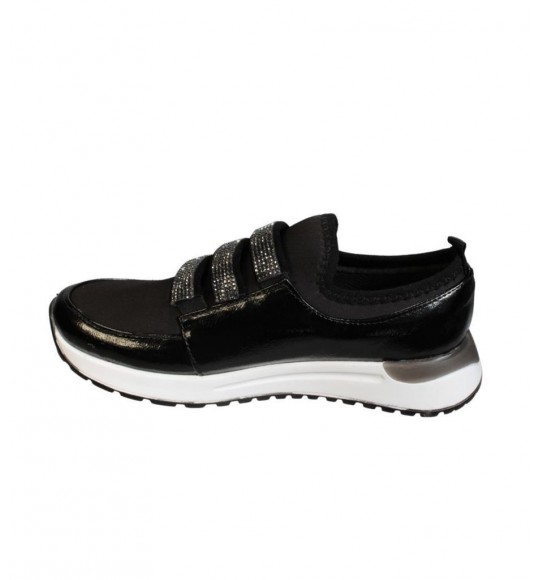 YAZKIŞ Kadın Siyah Rugan üzeri Streç Üç Bant Taşlı Ortopedi Taban Fashıon Spor Ayakkabı