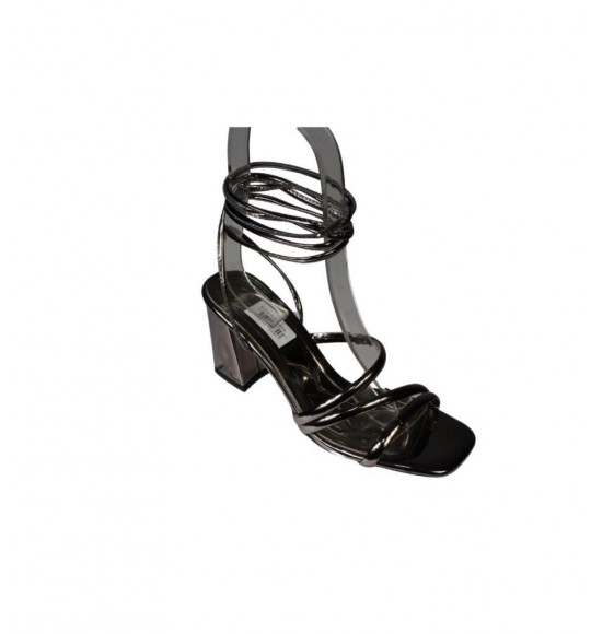 YAZKIŞ Kadın Gümüş Platin Rugan Çift Bantlı Bilekten Dolamalı 8cm Kalın Topuklu Ayakkabı