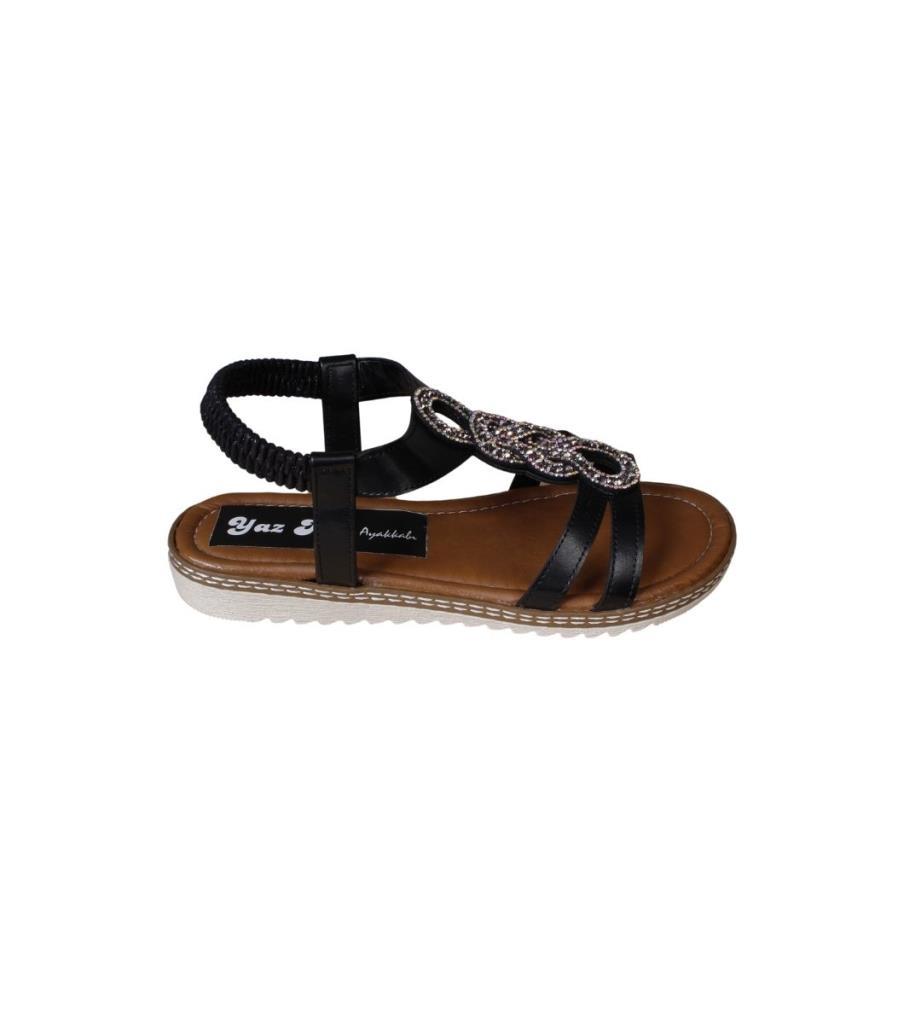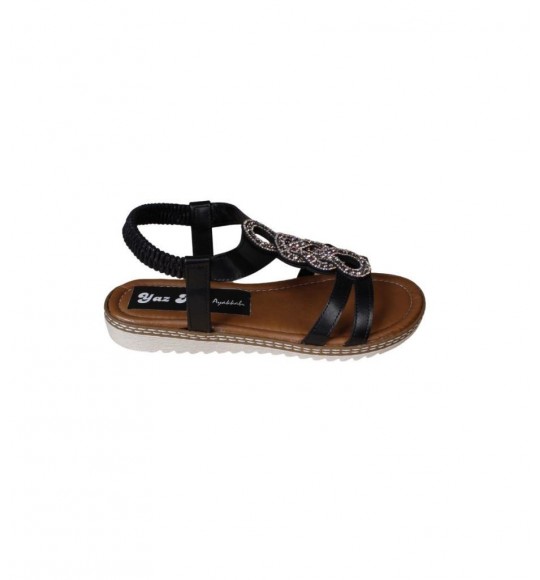 YAZKIŞ Kadın Siyah Üzeri Taşlı Bileği Lastikli Düz Taban Sandalet