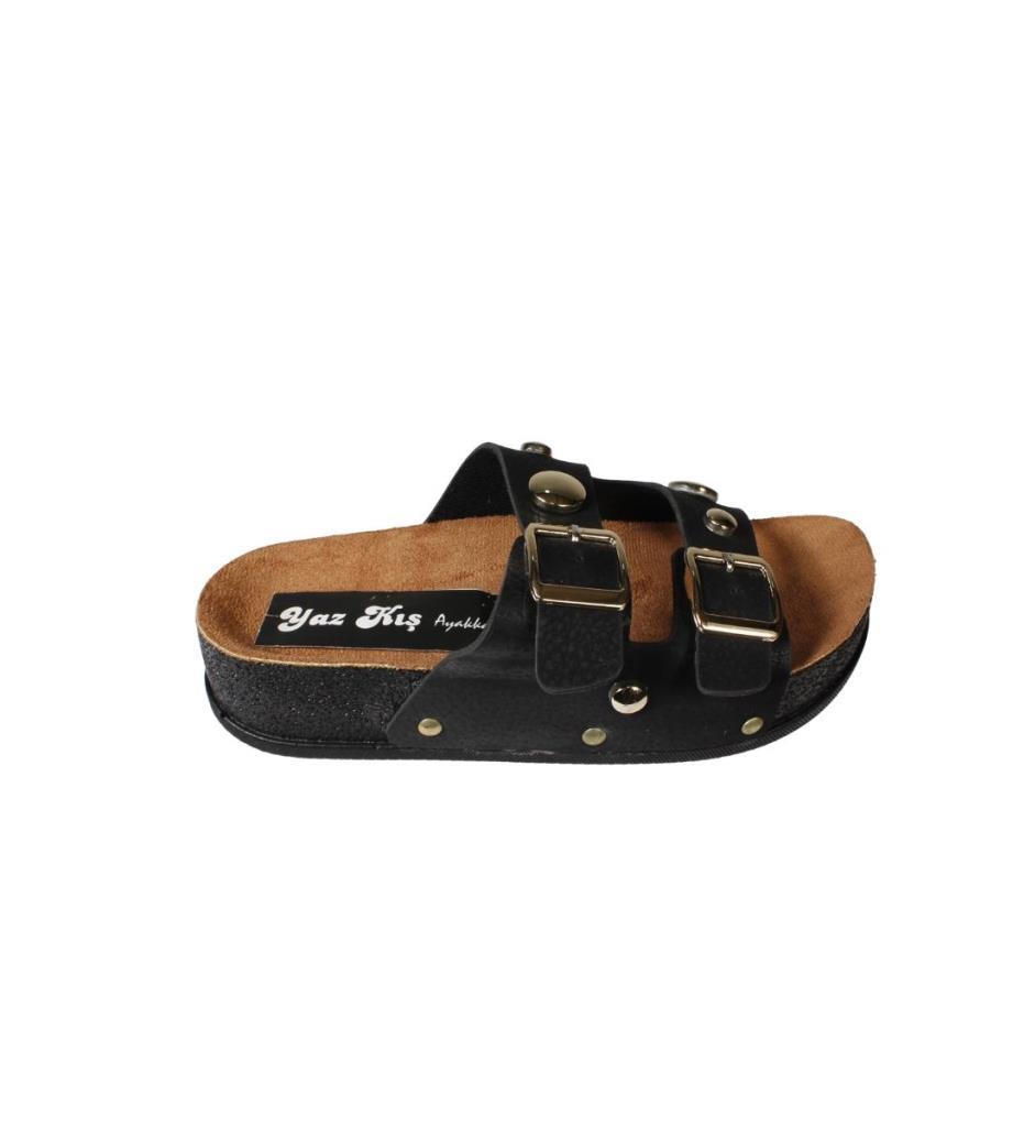 Şık tasarımıyla dikkat çeken siyah ten taşlı mantar taban terlik, yaz aylarında şıklığınızı tamamlar.